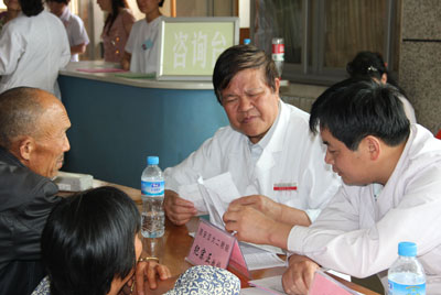 当日到达地点后,县医院的各个领导们已经在门口等候大家,前来咨询、看病的患者挤满了大厅。教授们没有时间休息,立刻穿上白大褂开始了诊治工作。现场气氛热烈,每位教授身边都排起了长龙,教授们耐心而详细为患者进行体格检查及问诊。每个就诊人员带着疑惑闻名而来,挂着笑容满意而去,并纷纷表示不出门、不排队、不挂号,在家门口就能享受到了交大二附院这种大医院的医护人员温馨、细致、专业的医疗服务感到非常高兴和欣慰,希望二附院多来义诊、交流和传播所学医学知识。黎一鸣主任带领其他的医生进入病房与患者深入交流,与当地医院的医护人员探讨病情。参加活动的党员群众同志,用实际行动践行了“医疗质量好、服务质量好、医德行为好、群众满意”的“三好一满意”服务理念。