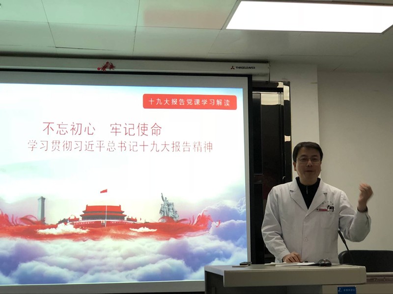 下午四点半,韩东刚支部书记向各位党员介绍此次学习的内容后,李小鹏副院长解读十九大报告党课学习拉开了帷幕,李小鹏副院长深刻分析了十九大报告的内容,对报告的题目和主题进行了详细讲解,对报告结构有针对性地进行了分析,紧扣党的十九大主题,围绕习近平总书记新时代中国特色社会主义思想这个主线,阐述了十九大报告的特点、重点和亮点,深入浅出地对党的十九大提出的新思想、新论断、新要求、新任务作了全面系统而又突出重点的解读,表明十九大报告宣告了中国新时代的到来,同时希望广大党员要牢记使命和责任,投身改革,锐意进取,为中华民族伟大复兴的目标不断奋斗。同时,李小鹏副院长理论联系实际,结合医疗卫生事业发展形势和医院实际,分析了当前医院改革发展面临的挑战和机遇,提出了医院今后一段时期的发展思路,技术引领,驱动新型医疗发展;提高医疗服务,追求卓越品质;强化医院管理,提高工作效率。他要求广大党员深入学习“十九大报告”,坚持以知促行,做讲政治、有信念,讲规矩、有纪律,讲道德、有品行,讲奉献、有作为的合格党员,为我院改革创新发展汇聚正能量,开创新局面。