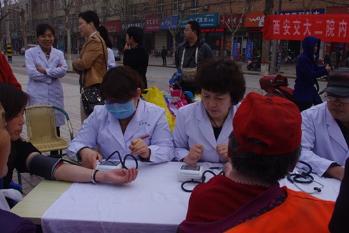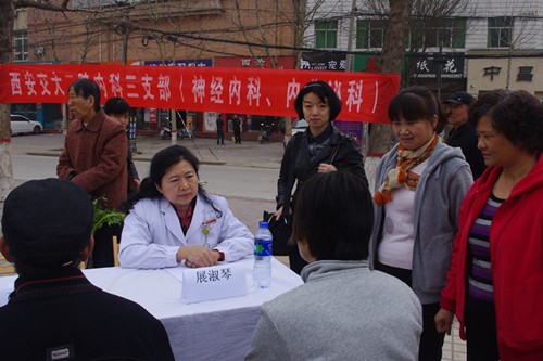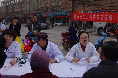 2015年3月22日,在院党委的大力支持下,神内与内分泌科党支部组织全体党员在支部书记张桂莲教授的带领下来到了兴平市省建十一医院开展了义诊活动。此次活动是我党支部积极响应党的十八大号召:“以服务群众、做群众工作为主要任务,加强基层服务型党组织建设“所组织的一次为民举措,受到了广大市民朋友的热烈欢迎,赢得了良好的社会口碑。