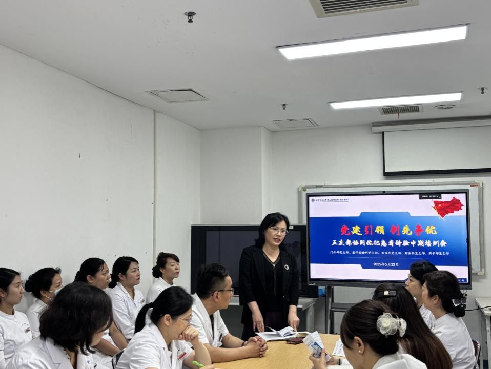 培训会在门诊部党支部王丽娟书记的主持下有序开展。王书记首先总结了“党建引领争先创优”活动开展以来取得的阶段性成果。她提到,通过实施“投诉倒追、原因分析、专项培训”等举措,门诊服务用语得到了有效规范,医务人员素养显著提升,并成功制定了《门诊服务用语手册》。为进一步确保活动取得实效,各支部需对2025年4月和5月的数据与去年同期进行详细对比分析,深入挖掘医疗服务的优势与不足,以便精准优化服务流程。