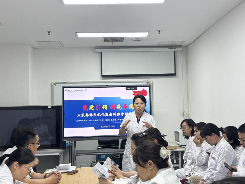 为进一步深化党建引领,促进党建工作与业务深度融合,推动门诊五支部“党建引领争先创优”协同优化患者就医体验活动取得实效,2025年5月22日下午2点30分,门诊部党支部在综合楼三楼外科示教室组织召开了“党建引领争先创优”五支部协同优化患者就医体验中期培训会。行风办赵晓娟主任、门诊部党支部王丽娟书记、医保办党支部曹婷书记、医保办郭景华副主任、财务部李小燕副主任、药学部党支部王娜书记及60余名党员同志出席会议。本次会议以“建立意识,渗透人文”为主题,旨在强化全员服务意识,将人文关怀全面融入医疗服务的各个环节。同时,本次会议也是支部带动群体工作建设的扩大会议。