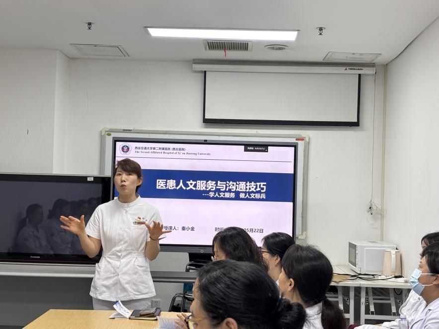 本次培训的重头戏是秦小金副护士长带来的《医患人文服务与沟通技巧》专题培训。秦小金副护士长凭借丰富的临床经验和深厚的人文素养,从医患人文服务概述、医患服务礼仪与人文服务、医患服务沟通技巧三方面入手,深入浅出地讲解了医患人文服务的理念、重要性以及在实际工作中的应用方法。她通过真实案例分享和互动交流,生动展现了在诊疗过程中如何运用有效的沟通技巧缓解患者焦虑、建立信任关系,使患者在就医过程中不仅感受到身体的治疗,更体会到心灵的关怀。秦护士长还总结出“三板斧、三个一”的实用技巧,即从意识上、行动上、态度上做到一个微笑、一个您好、一个礼让,倡导医务人员从心出发,以暖为径,从己做起,将人文关怀融入每一个服务细节。