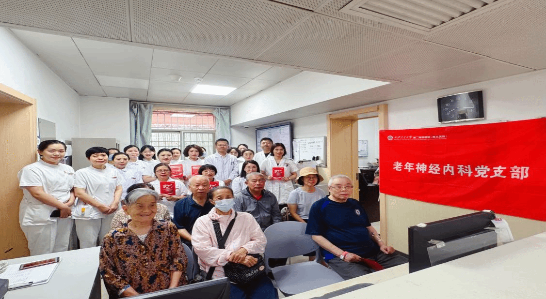 为热烈庆祝中国共产党成立104周年,深入贯彻院党委关于开展“永远跟党走 医路守初心”庆七一主题活动的部署要求,6月26日上午,老年神经内科党支部在病房活动区精心组织了一场别开生面的主题党日活动。活动邀请了住院患者中的老党员同志共同参与,将红色教育、医者初心与尊老敬贤有机融合。