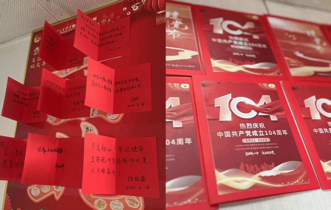 共执笔,贺华诞,祝福流淌纸墨间。组织委员姚婕带领大家亲手制作了精美的贺卡,在温馨感人的氛围中,支部党员与老党员们围坐一堂,共同在贺卡上写下对党的深情祝福:永远跟党走、党引领春风路万里,民逢盛世中国梦、104年风雨兼程,共赴星辰大海……一句句质朴而滚烫的话语,承载着跨越年龄的共同信仰与对党的无限热爱。年轻党员们纷纷拍手表示:前辈们的讲述是生动的教科书,他们的坚韧与奉献,正是我们守护生命、服务患者的榜样力量。活动最后我们共同激情合唱了“没有共产党就没有新中国”。