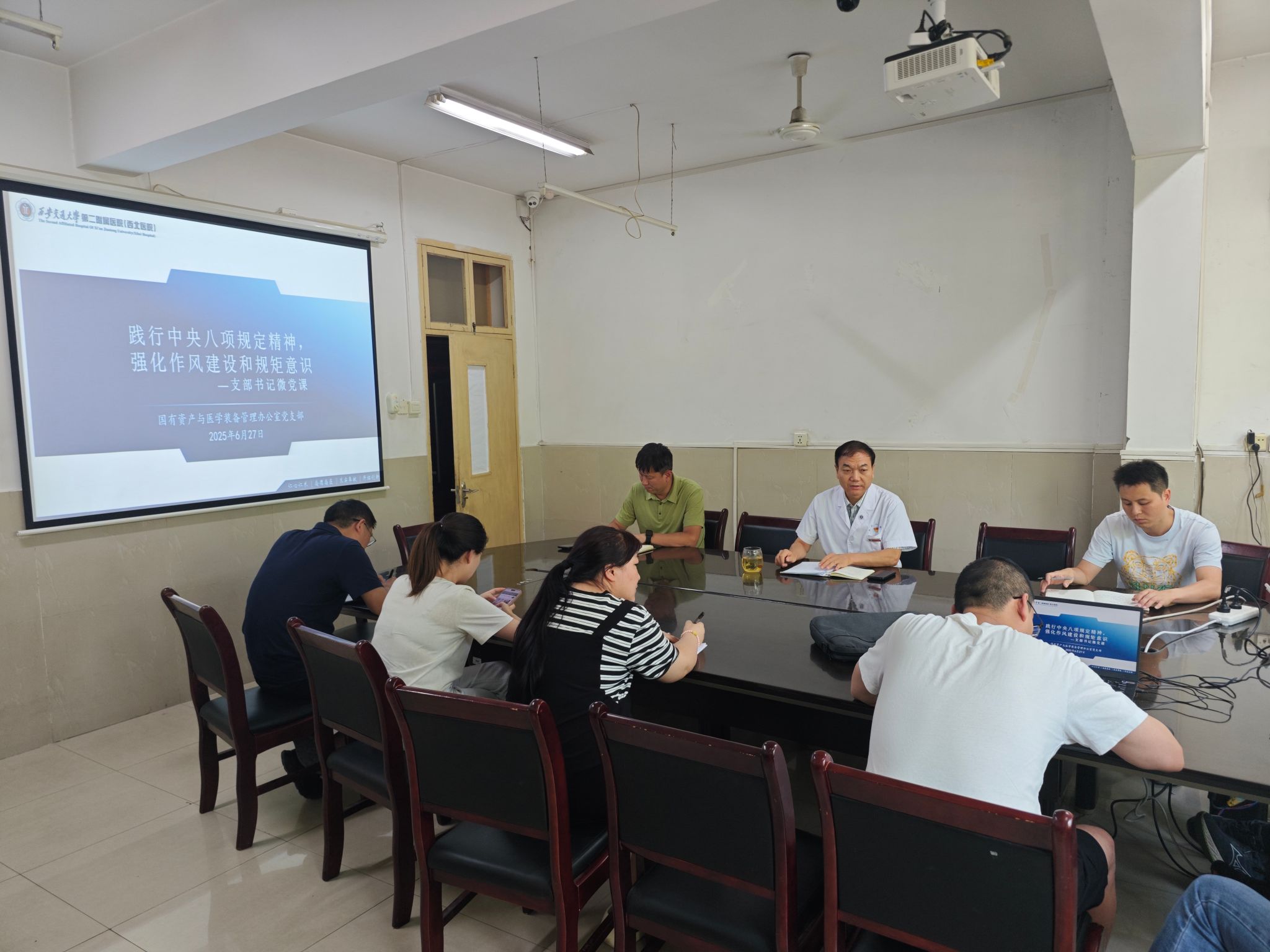 2025年6月27日下午2时30分,医院国有资产与医学装备管理办公室(以下简称国装办)党支部在国装二楼会议室举办以“践行中央八项规定精神,强化作风建设和规矩意识”为主题的专题微党课。本次学习支部全体党员、发展对象及入党积极分子共同参会,会议由国装办党支部书记、主任叶泽宇主持,旨在深化支部全员对中央八项规定精神的理解与实践,强化作风建设,牢固规矩意识。