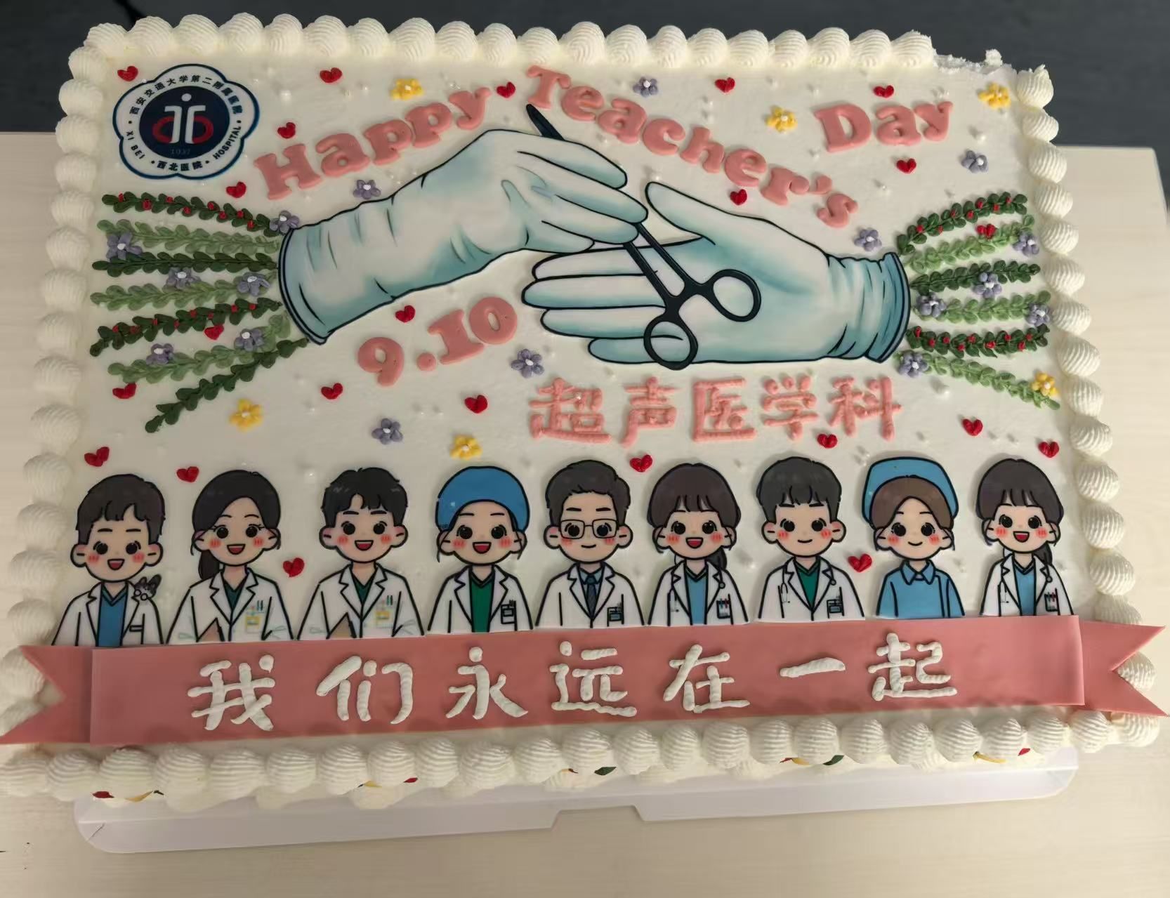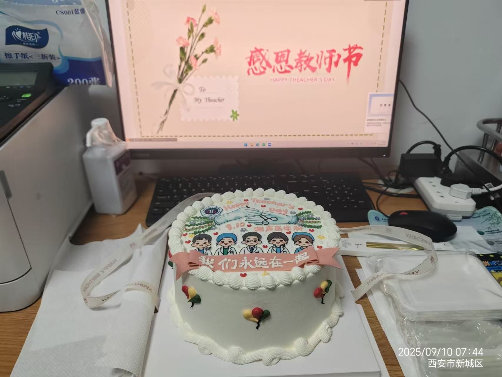 活动伊始,一场温馨的教师节庆祝仪式拉开帷幕。考虑到科室成员分布在两院区的实际情况,党支部特意搭建线上联动平台,让两院区医务人员同步参与、共享温情,节日蛋糕上 “我们永远在一起” 的字样格外醒目,传递着对科室前辈的敬意。