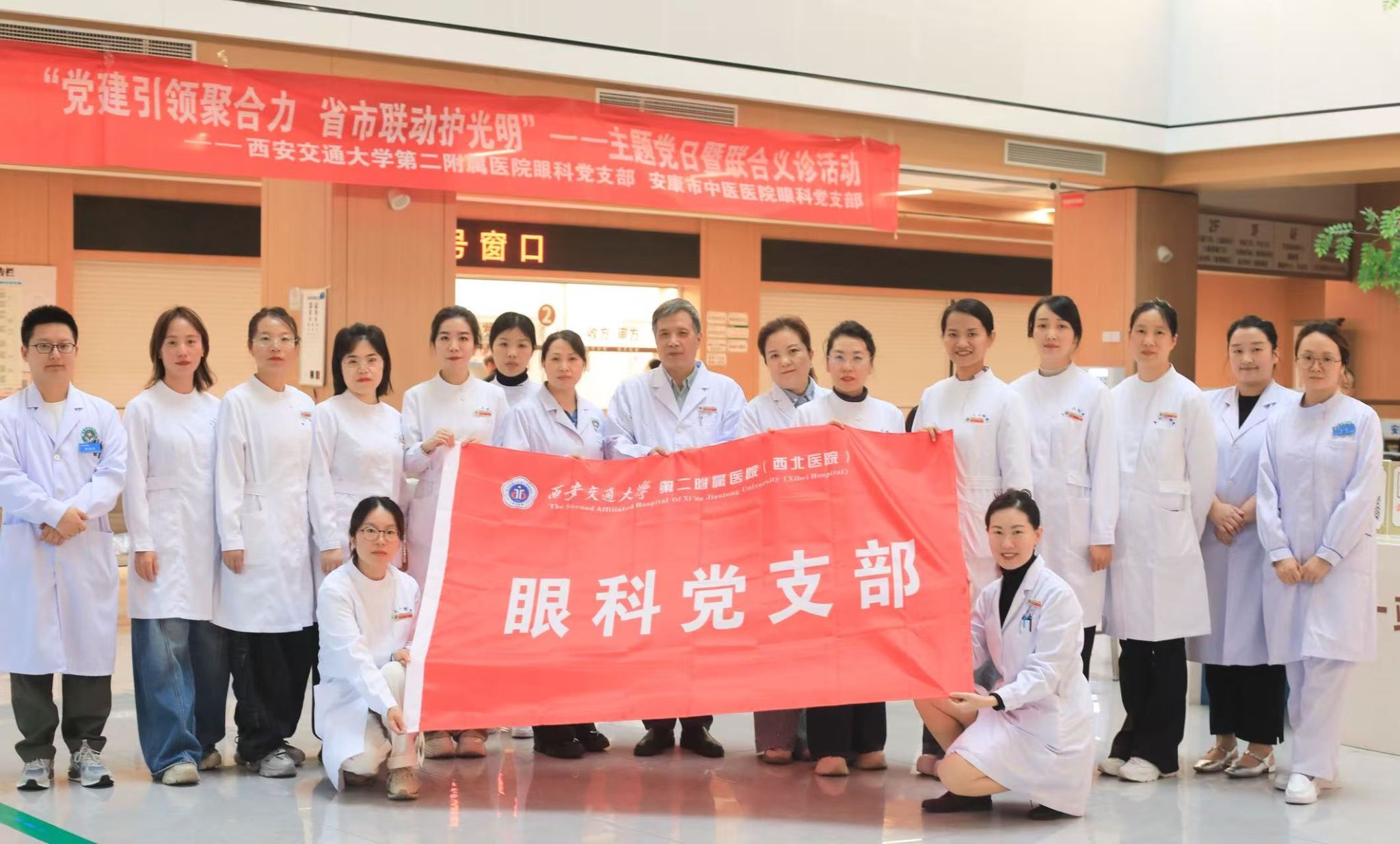 在我院建院88周年之际,眼科党支部积极响应院党委“1+N”活动号召,丰富深化党建强科行动,加强党支部建设,推进党建与业务互融互促,10月18日下午,西安交通大学第二附属医院眼科党支部与安康市中医医院眼科党支部携手,在安康市中医院门诊大厅联合开展“党建引领聚合力 省市联动护光明”义诊暨主题党日活动,献礼院庆、服务民生。解决了基层群众“看病远、看专家难”的问题,将优质医疗资源下沉至秦巴山区,以“党建+医疗”为纽带,数名党员医护骨干下沉基层,为当地群众送去专业眼健康服务,用实际行动践行“以人民为中心”的宗旨。