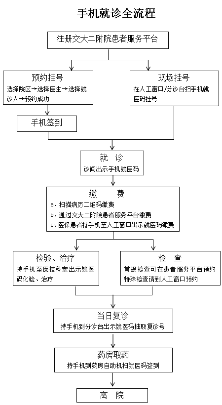 为了让您在我院的就医过程更加便捷、高效,我院现已开通手机全流程就诊服务。您可通过手机上的西安交大二附院患者服务平台,轻松完成挂号、缴费、就诊、检验、检查以及取药等所有环节。以下是关于手机全流程服务的相关信息,我们将竭诚为您服务!