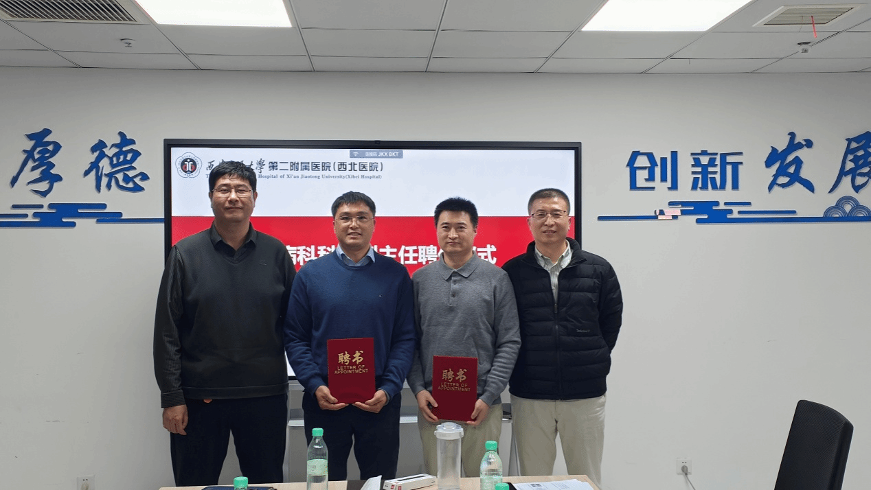 人才是第一资源,创新是第一动力。为强化科研组织引领,科室隆重举行科研副主任聘任仪式。西安交通大学青年拔尖人才A类入选者李海教授、王一东教授正式受聘为肝病科科研副主任,由西安交大第二附属医院学科建设办公室副主任刘朋飞教授为两位教授颁发聘书。两位教授在感染肝病基础研究领域深耕多年,学术造诣深厚,科研成果丰硕。他们的加入,必将为科室科研工作注入强劲动能,引领学科在基础研究与临床转化领域实现新突破。