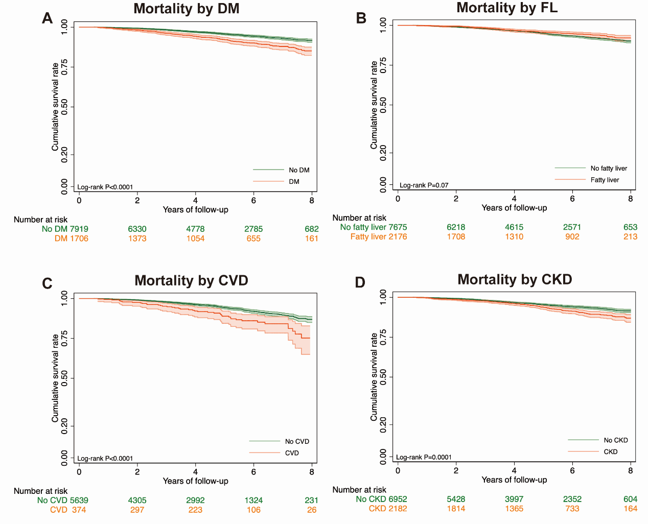 图 2. 基线合并糖尿病、脂肪肝、CVD、CKD的患者生存率