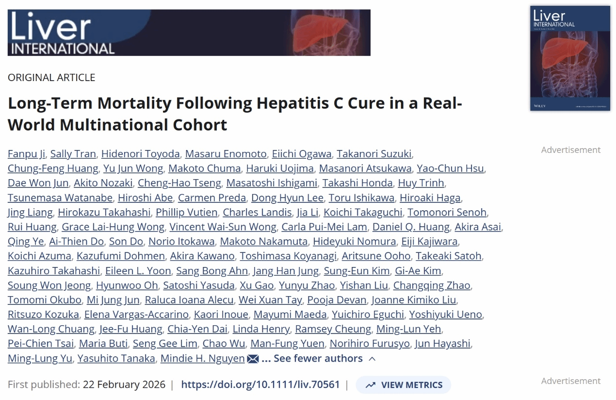 丙型肝炎病毒(HCV)感染者经直接抗病毒药物(DAAs)治愈并获得持续病毒学应答(SVR)后,整体预后显著改善,死亡率明显下降。目前,HCV治愈后长期死亡风险、关键危险因素及不同人群(性别、种族)中的差异尚不明确,缺乏大样本、多地域、长随访的真实世界高级别证据,成为制约丙肝治愈后精准管理的关键瓶颈。为破解这一临床难题,我院肝病科以Sub-PI牵头、联合全球39个研究中心开展了大型国际多中心研究,系统评估DAAs治愈后患者的长期死亡率及相关影响因素,为丙肝治愈后的精准随访、个体化管理及全球丙肝消除策略提供科学支撑。相关研究成果近期在线发表于国际肝病领域著名期刊《Liver International》。我院为该研究的第一作者单位,肝病科纪泛扑教授为唯一第一作者,该研究通讯作者为国际知名肝病专家美国斯坦福大学医学中心胃肠与肝病学部、流行病学与人群健康系Mindie H. Nguyen教授,彰显了我院在肝病领域临床研究与国际合作的硬核实力。
