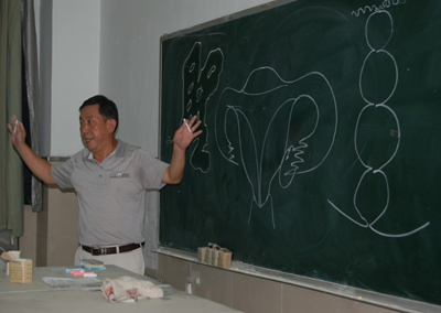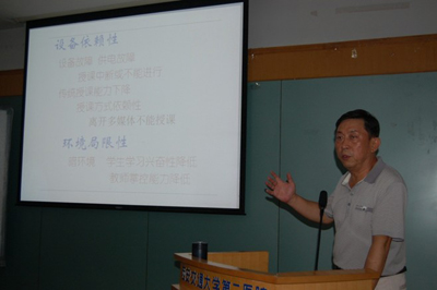 8月27日,马教授讲授了“多媒体授课利与弊”,谈到多媒体的劣势时,他认为多媒体教学中教师与学生情感交流较少,学生对课件的依赖性较强,教师想传授给学生更多的知识,导致信息量过大,因此课堂上快马加鞭赶内容,而学生则疲于奔命作笔记,没有思考时间。教师过度依赖多媒体,容易照本宣科而不脱稿。在多媒体的制作上也存在制作不良的情况。因此,多媒体授课虽有优点,但不能替代传统优势,应该互为补充 ,各尽其长,为防止设备与格式不匹配,必要时应该准备二手方案进行传统授课。授课应该因人施教,不同学历层次深度不同、不同专业内容不同,反对“一个课件包打天下 ,上下通吃”。马教授认为必要时应该进行板书绘图,他熟练地运用粉笔在黑板上进行单手、双手绘图,给大家演示了绘图的方法和技巧,开拓了教师们的思路。