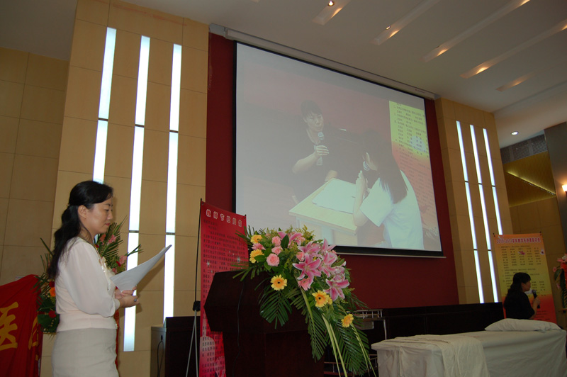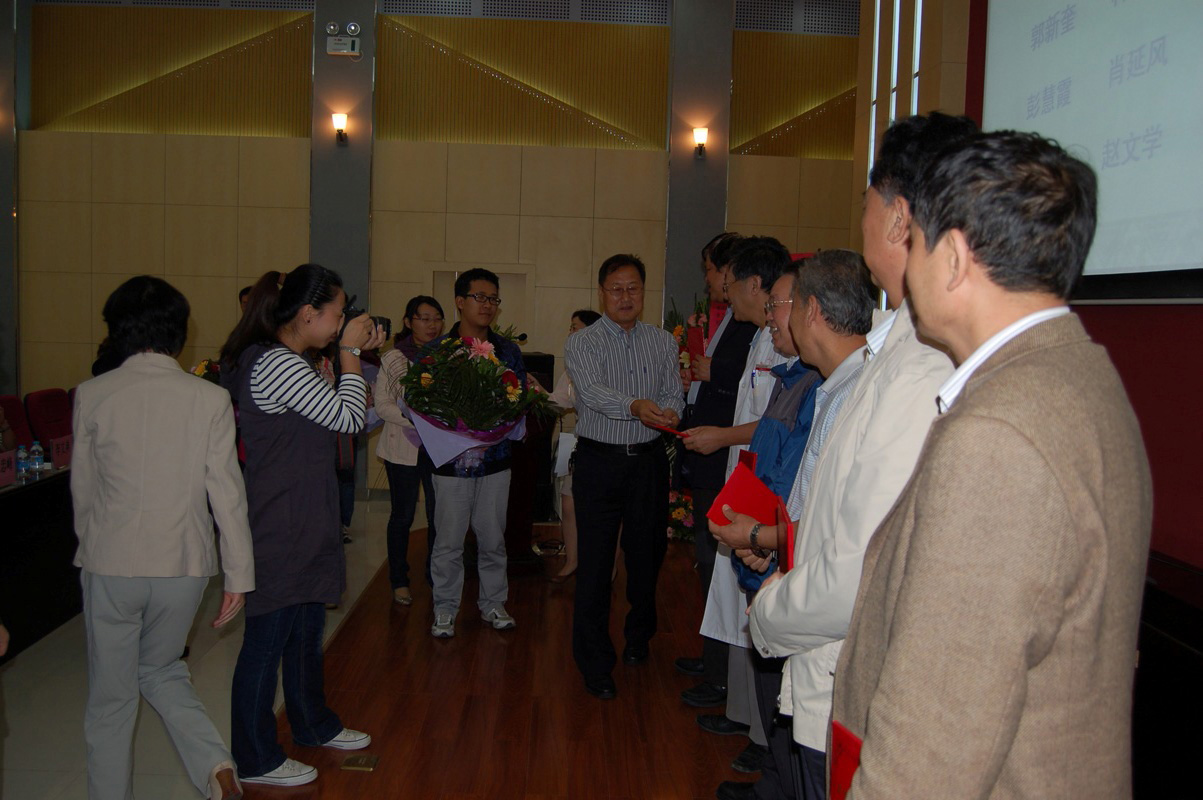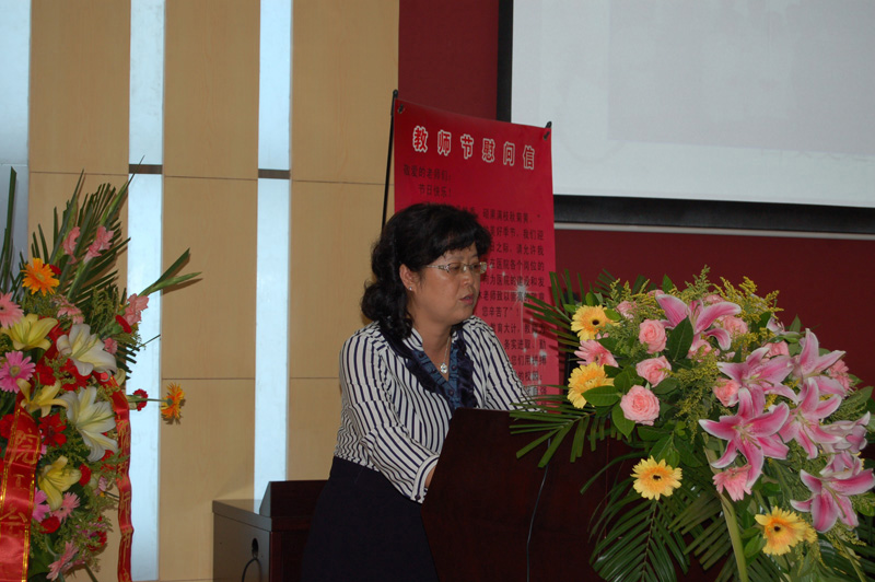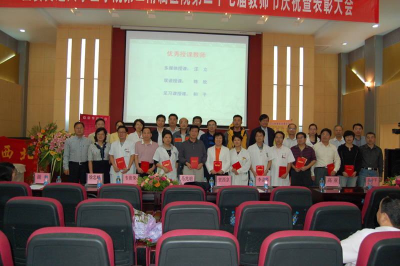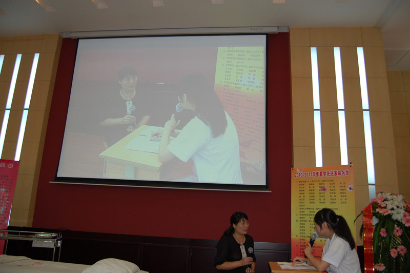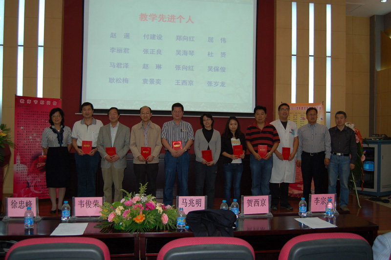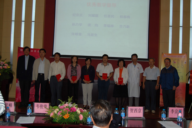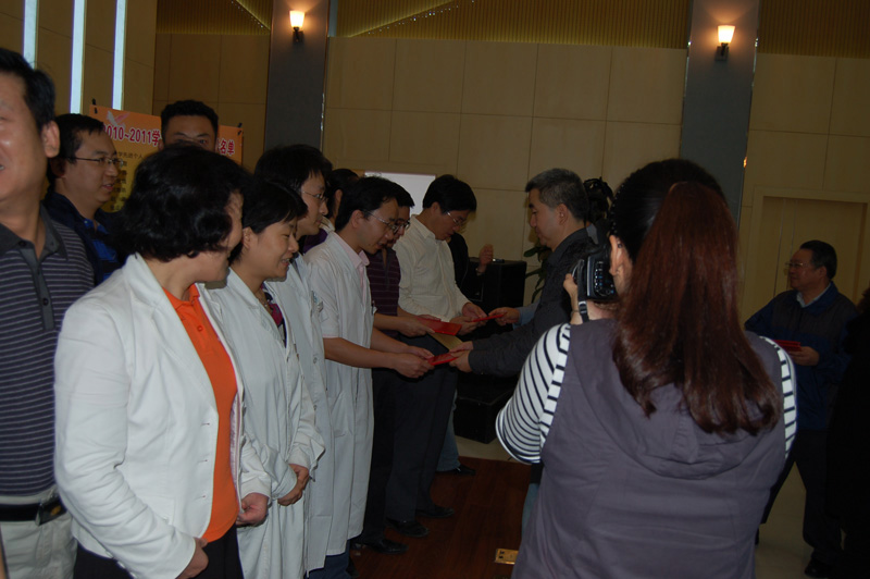 巩守平副书记隆重宣读了我院2010-2011学年优秀实习带教科室、优秀研究生带教单元、教学先进个人、优秀导师、优秀实习带教老师、优秀授课教师、优秀教学督导、校级授课竞赛获奖教师、优秀教学管理人员、优秀教学秘书及教辅人员、优秀国家级继续教育项目负责人等获奖名单,对获奖集体和个人表示热烈的祝贺,对全院教师致以诚挚的节日祝福!本年度我院共评选教学先进集体 5个,先进个人94人。随后,在悠扬的音乐声中,校、院领导、督导专家向获奖集体和个人进行了颁奖和祝贺。我院学生代表也为督导专家们献上了美丽的鲜花,07(7)学生李梦丹以流利标准的英语贺词代表同学们向敬爱的老师们送去深深的敬意和祝福!