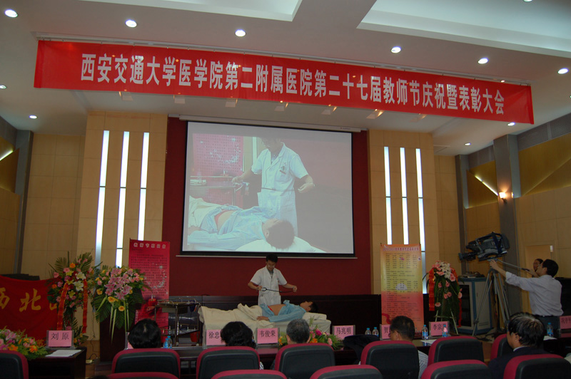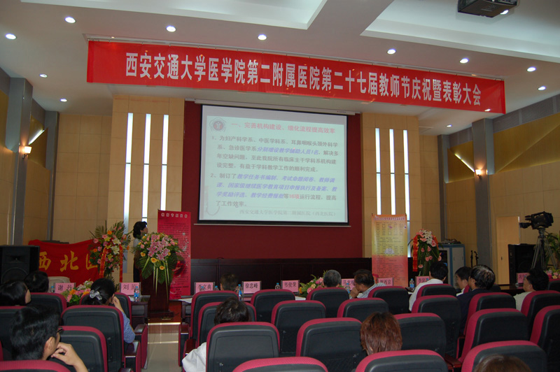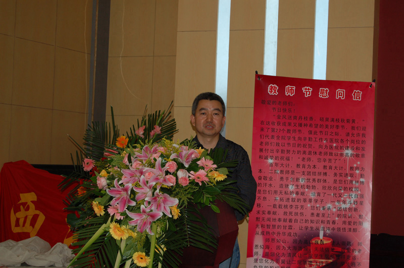 庆祝大会在欢庆的音乐声中开始。首先贺西京院长代表院领导对全院教师致以节日的问候!感谢大家多年来对我院教学工作所做出的辛苦和努力!感谢德高望重的督导对我院教学工作的辛勤付出!正是因为有了大家的不懈努力,才确保了我院教学工作的顺利进行和成绩的取得,以后的工作中院方会更加注重对教学的投入和激励政策,希望全院师生再接再厉,争取更多更大的成绩。