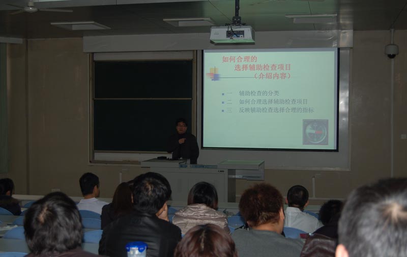 张岁龙副教授,主讲题目为临床诊断思维训练——辅助检查的合理选择和临床意义。在讲授过程中,张教授指出了在临床工作中面对多样的辅助检查项目,如何选择对病人有意义、也就是既要查出病,也要尽可能为患者减轻痛苦、减轻负担,对于刚刚接触临床工作的学生来讲,无疑是一个很难的选择。通过多年的临床经验,张教授将自己总结的一套各种辅助检查的原理和临床意义向同学们进行了详细讲解,强调了能用简单的、便宜的辅助检查能够明确诊断,最好不要选择复杂的、昂贵的项目,特别是对重危病人不但询问病史和体格检查要简明扼要,而且选择辅助检查更要精简,尽早治疗或者治疗检查同步进行。另外,结合自己的专业特点,张教授详细讲述了疑为