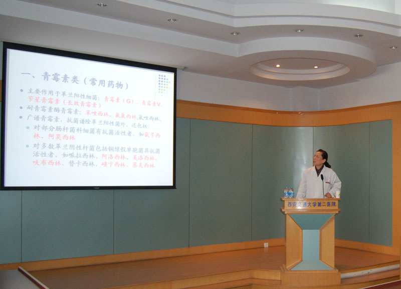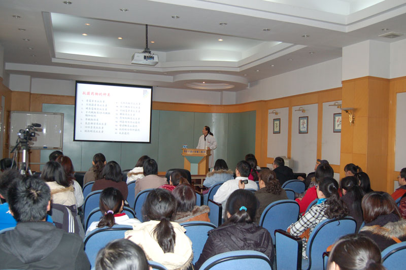 讲座过程中,仵教授主要讲了抗菌药物的分类,及其各类药物的抗菌谱、抗菌活性、肝肾毒性以及使用注意事项等,目前,由于抗菌药物在临床上应用广泛,但有关使用注意事项的报道甚少, 了解抗菌药物在使用时的注意点,对于我们这些刚刚接触临床工作的学生来讲,无疑是非常有必要的。另外针对近期引起社会广泛关注的“超级细菌”, 仵教授为我们详细讲述了“超级细菌”究竟是什么细菌?其致病力如何?应如何防范感染?对于“超级细菌”我们应该如何应对?这些问题吸引着在场的每一位听众,整个讲授过程效果良好,气氛热烈,受到本科生、进修生和研究生一致好评。