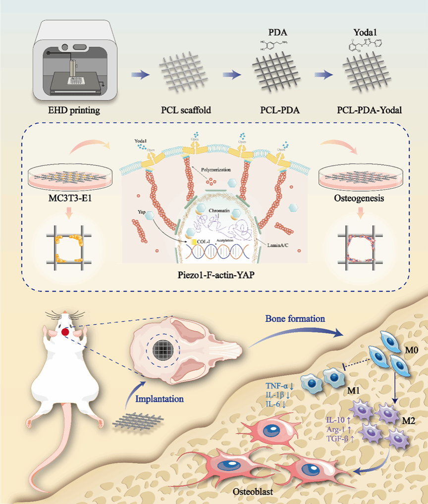 本研究基于电流体动力学技术制备了聚己内酯(PCL)微纤维支架,并通过聚多巴胺涂层实现表面改性,以高效负载小分子激动剂 Yoda1。研究表明,该复合支架在体外能显著促进MC3T3-E1成骨细胞的粘附与分化。这一促进作用可能源于Yoda1激活Piezo1-F-actin通路,进而增强YAP蛋白核内定位并上调COL-I蛋白表达,该过程亦受到赖氨酸组蛋白乙酰化修饰的调控。体内实验进一步证实,该支架不仅可改善局部炎症微环境,还能有效促进新骨生成。上述研究成果提示,负载Yoda1的PCL微纤维支架在改善免疫微环境和促进骨再生方面具有协同效应,为小分子药物Yoda1在骨缺损修复中的临床转化提供了理论依据与实践基础。