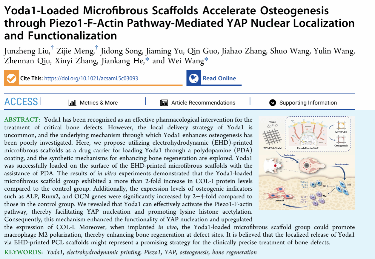 近日,西安交通大学第二附属医院骨科中心王伟教授与西安交通大学机械学院贺健康教授团队在骨修复领域的研究取得重要进展。研究成果以《负载Yoda1的微纤维支架通过Piezo1-F-Actin通路介导的YAP核定位和功能化加速骨生成》(Yoda1-LoadedMicrofibrousScaffolds Accelerate Osteogenesis throughPiezo1-F-Actin Pathway-Mediated YAP Nuclear Localization and Functionalization)为题发表在国际生物材料权威期刊《ACS应用材料与接口》 (ACS Applied Materials & Interfaces)上。西安交通大学为本文第一通讯单位,西安交通大学博士生刘君政为本文第一作者,西安交通大学王伟教授、贺健康教授为本文共同通讯作者。