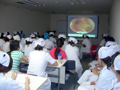 培训由吴彩芹总护士长主持。首先进行的是每月一次的护理查房,由张阿玲等3名护士做了题为“慢性中耳炎围手术期的护理”多媒体讲课,并选择了一位79岁手术后第六天正在住院治疗的中耳炎病人,现场详细讲解了慢性中耳炎的病因病理、临床表现、术前术后观察重点及护理要点等之后,将护士分成两批,结合这位中耳炎病人的特殊情况,在病人床旁与病人交流,使护士对中耳炎手术的护理有了更详尽的掌握。杜小滢副护士长、杨慧副护士长针对护理查房提出问题、指出优点和不足,护士们也纷纷发言,踊跃提出自己的观点。每月一次的护理查房,对护理人员尤其是年轻护士的成长、专业技术知识的掌握是一个很大的提升。