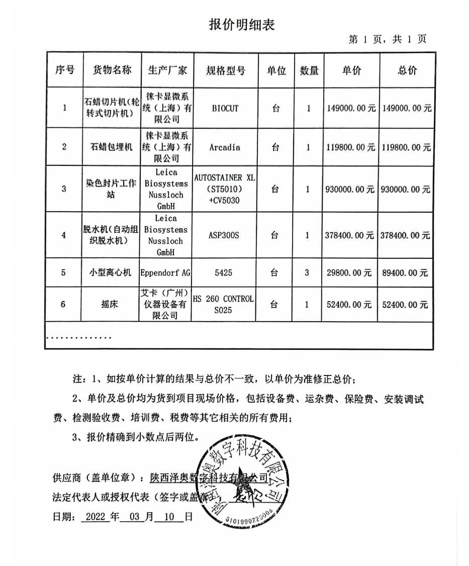 2 | (3标段)陕西泽奥数字科技有限公司 | 石蜡切片机(轮转式切片机)、石蜡包埋机、染色封片工作站、脱水机(自动组织脱水机)、小型离心机、摇床 | 详见投标文件报价明细表 | 详见投标文件报价明细表 | 1批 | 详见投标文件报价明细表 |