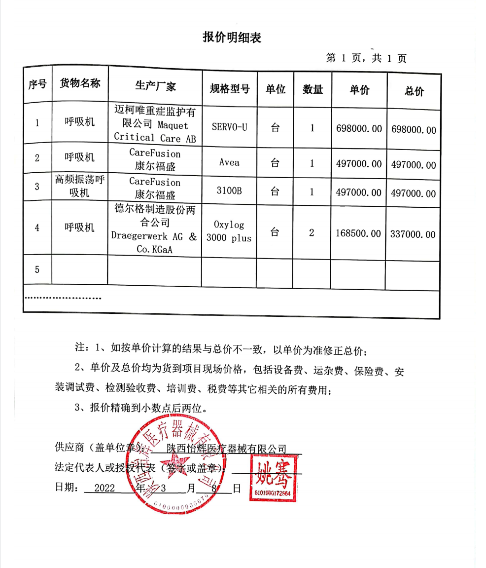 1 | (1标段)陕西怡辉医疗器械有限公司 | 膈神经电辅助有创呼吸机、实时跨肺压监测有创呼吸机、高频震荡通气呼吸机、转运呼吸机 | 详见投标文件报价明细表 | 详见投标文件报价明细表 | 1批 | 详见投标文件报价明细表 |