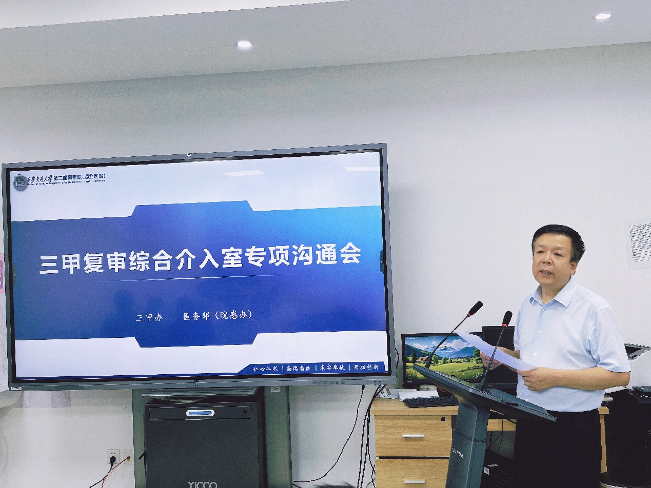 为进一步提升我院介入管理工作质量、优化相关流程,2024年6月26日,三甲办结合三甲复审院内检查的相关结果,组织多部门在医学影像科示教室召开了介入工作专项沟通会议。会议由张蓬勃副院长主持,医务部(院感办、质控办)、后勤保障部、国装办、手术室、综合介入室等部门相关负责人参加。