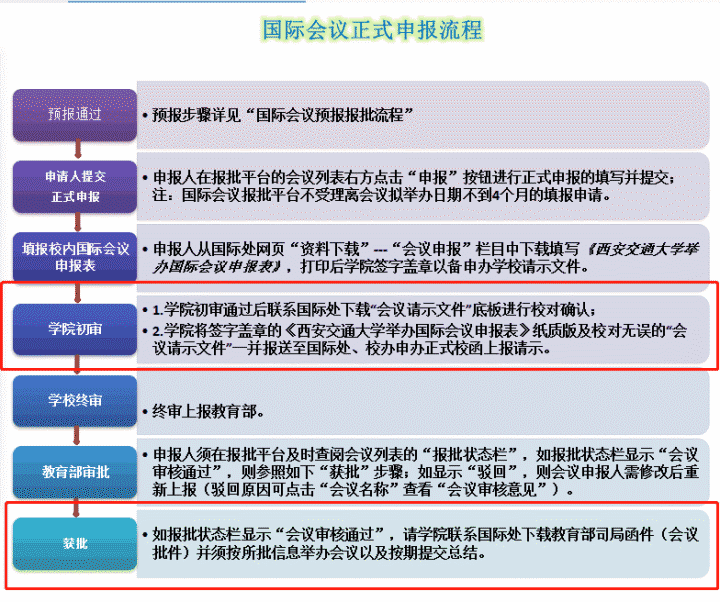 根据学校通知,我院已经预报审核通过的国际会议现可启动正式申报工作,请有关科室于2018年11月23日前完成申报。要求完成网上申报(附件1),并填写《西安交通大学国际会议申报表》(附件2)由主任签字后交至医院办公室,联系人:桑田,联系电话:87678421。