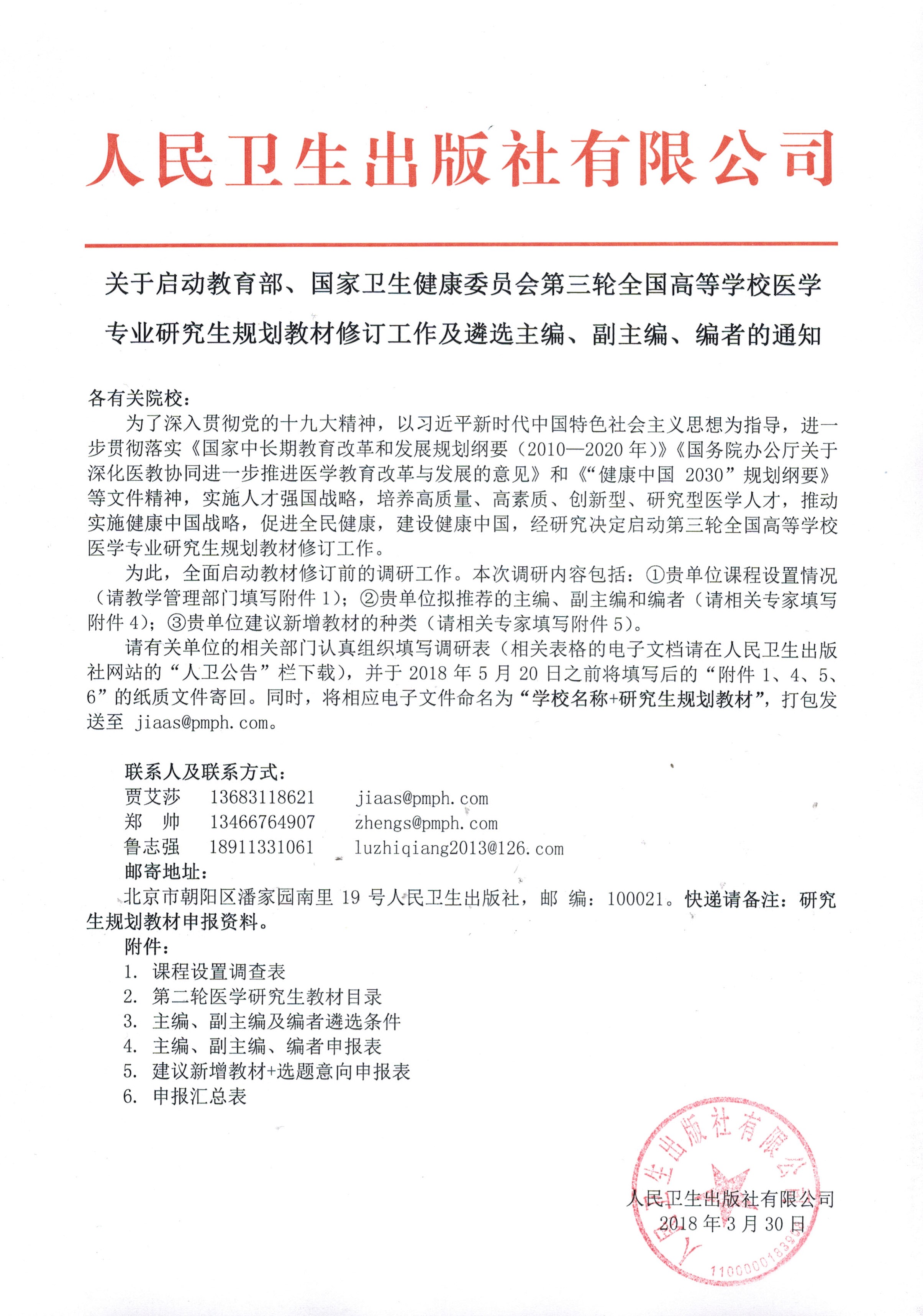接医学部通知,教育部、国家卫生健康委员会第三轮全国高等学校医学专业研究生规划教材修订工作及遴选主编、副主编、编者的工作正在开展,请相关老师积极申报,具体详见附件。申报人员需在2018年5月15日下午6点前将附件4. 5.6填写后报送至教务部研究生管理办公室,并将电子版发至邮箱327639644@qq.com