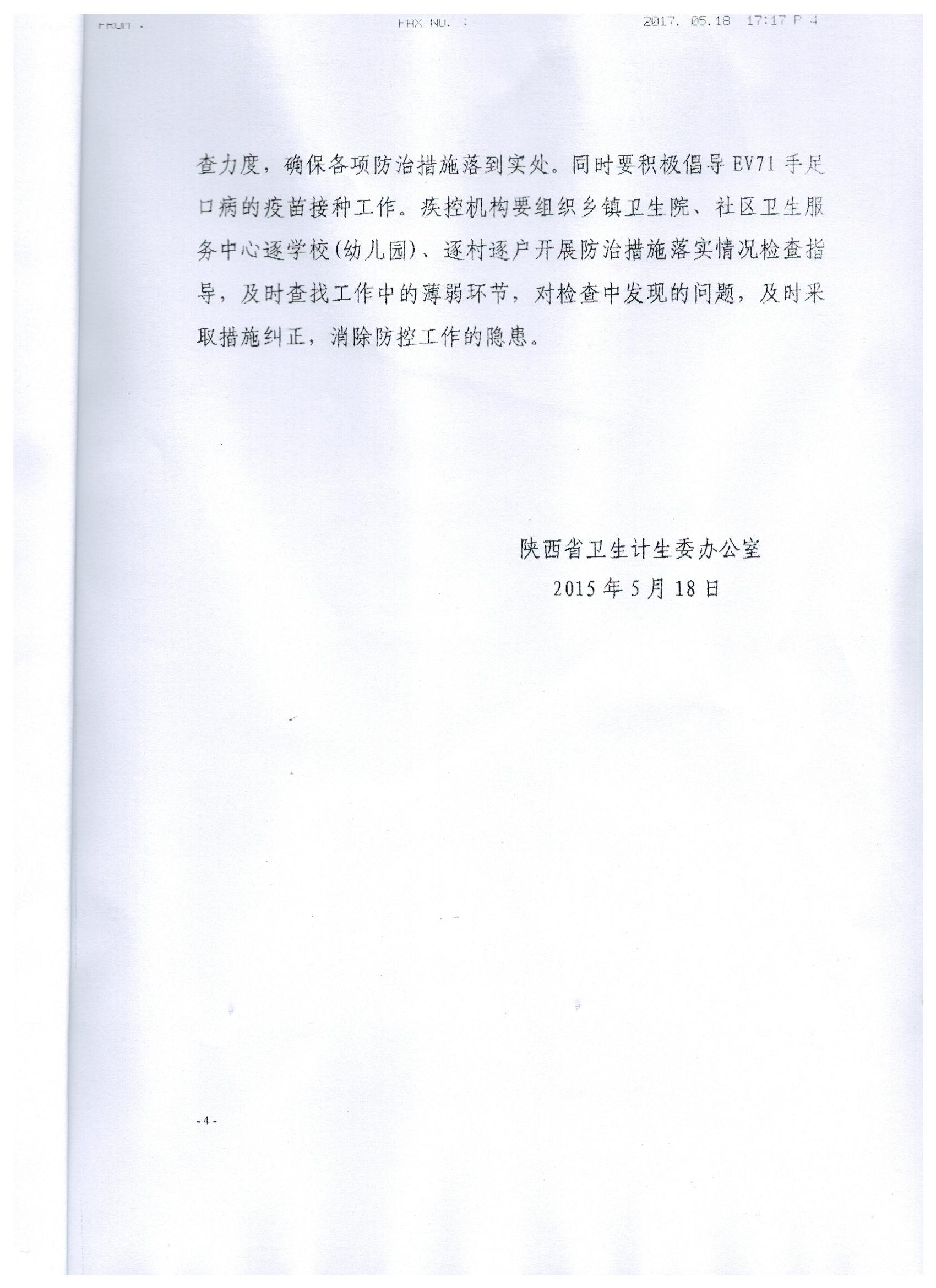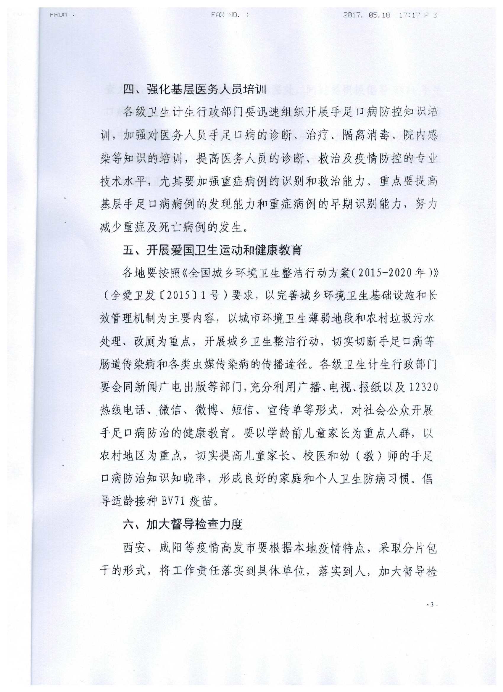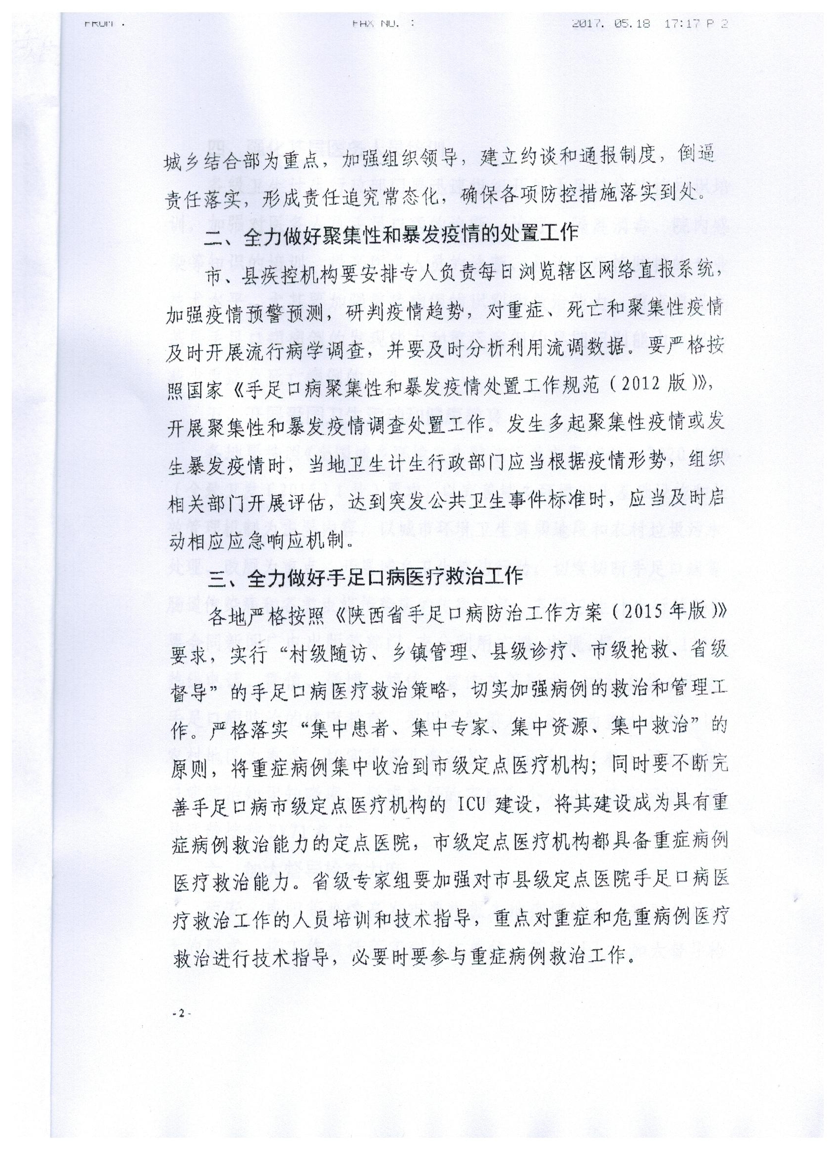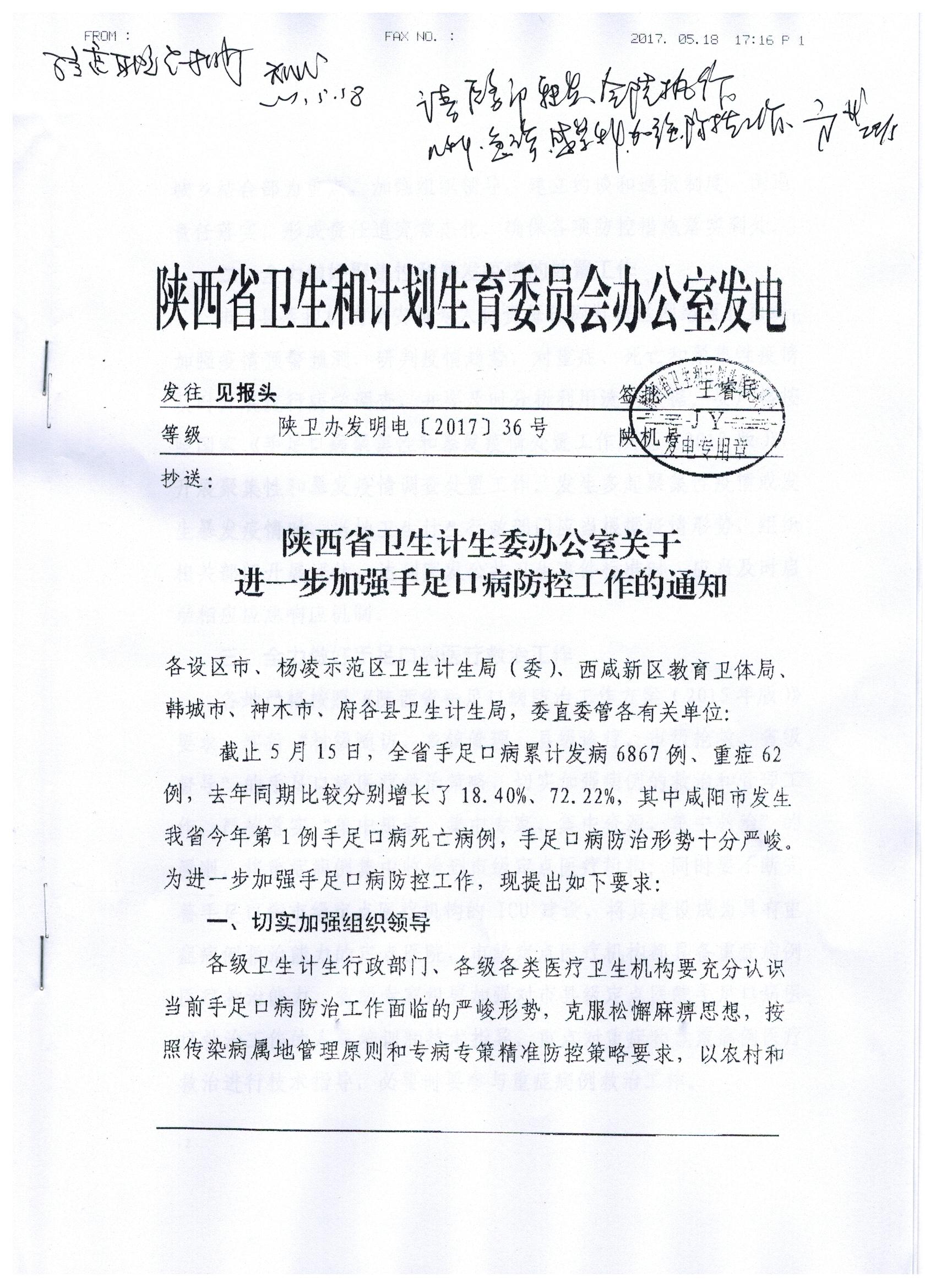 现将陕西省卫生计生委办公室关于《进一步加强手足口病防控工作的通知》(内容见附件)转发给你们,请组织认真学习。