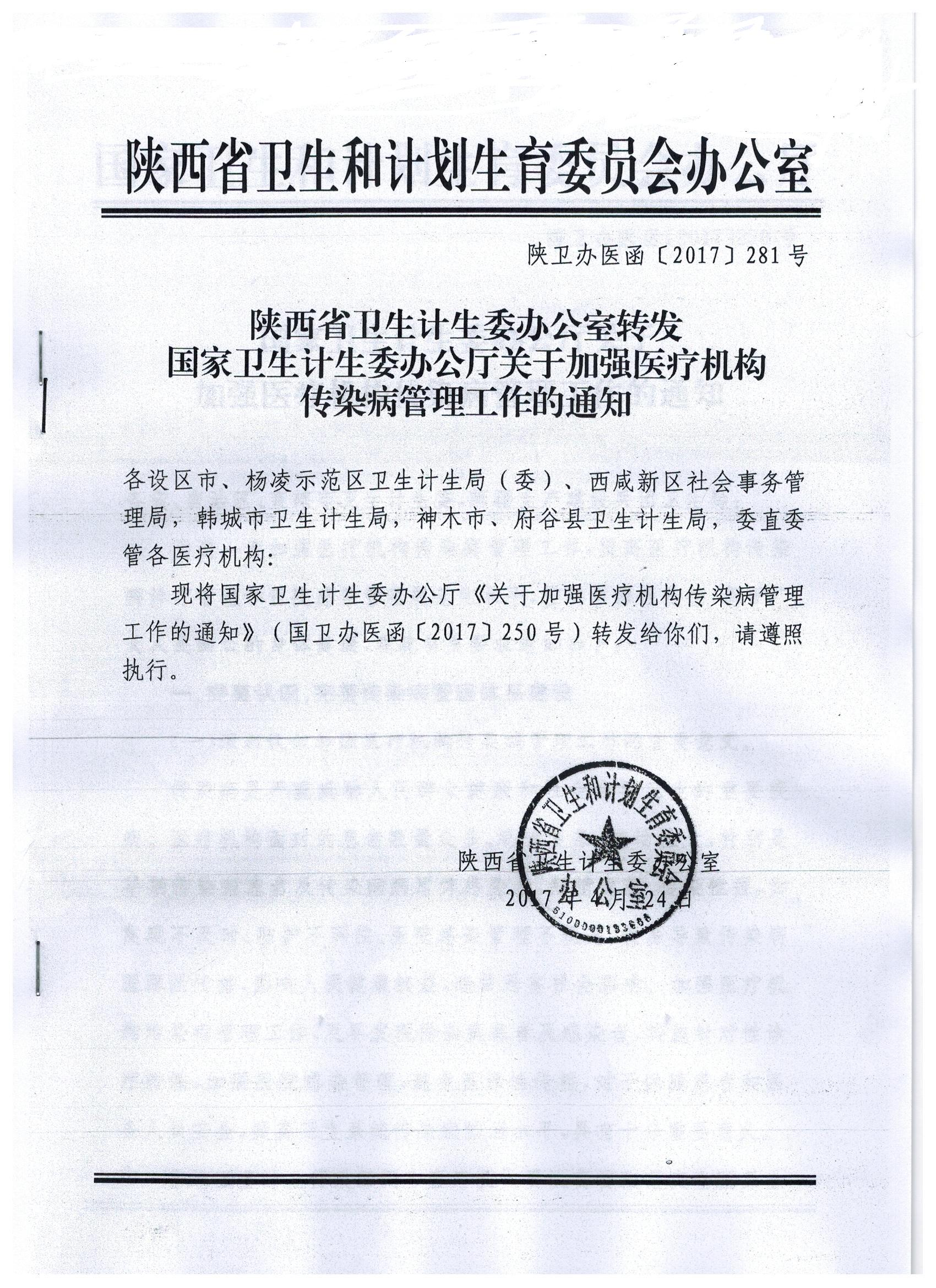 为进一步加强医疗机构传染病管理工作,提高医疗机构传染病诊疗管理和医院感染管理规范化水平,控制医源性传播,保护广大人民群众的身体健康,现将《陕西省卫生计生委办公室转发国家卫生计生委办公厅关于加强医疗机构传染病管理工作的通知》转发(详见附件),请遵照执行。