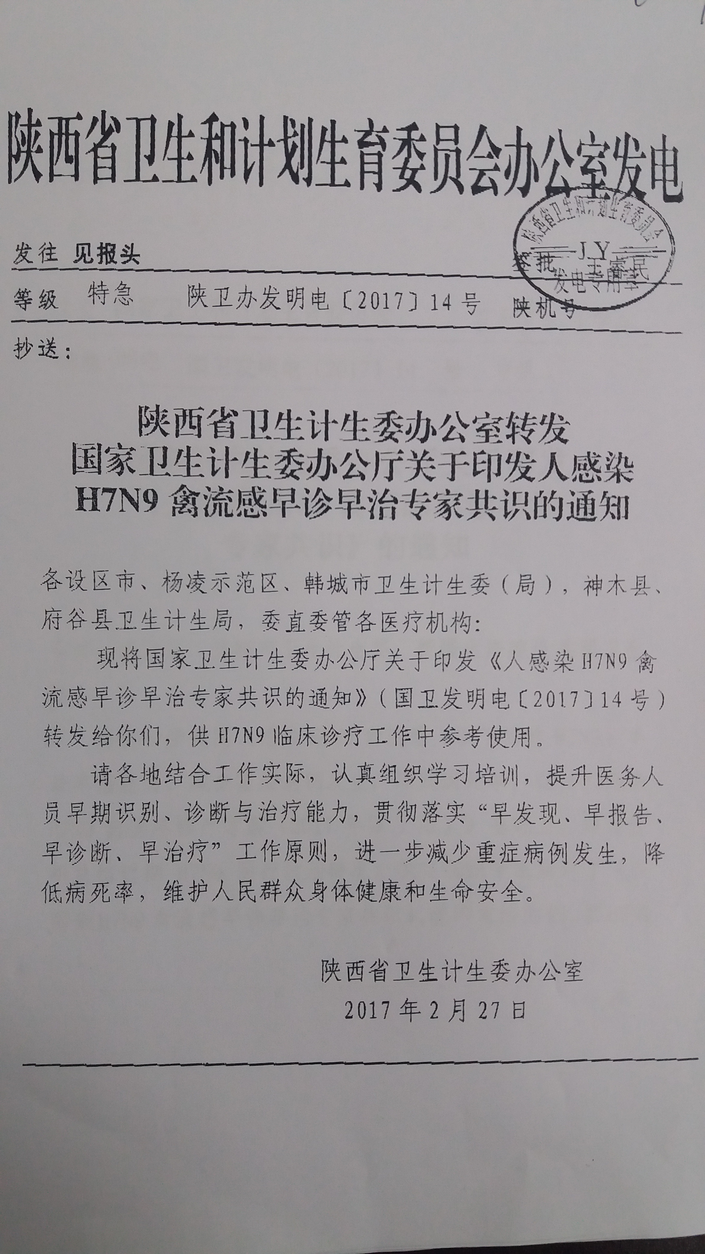 附件1陕西省卫生计生委办公室转发国家卫生计生委办公厅关于印发人感染H7N9禽流感早诊早治专家共识的通知.jpg