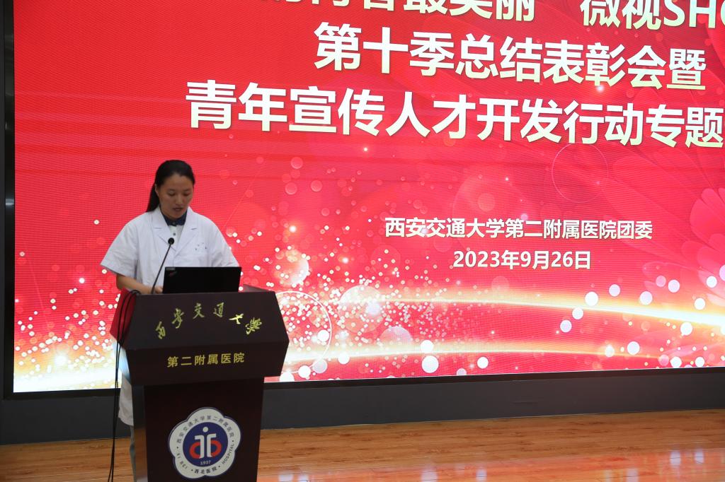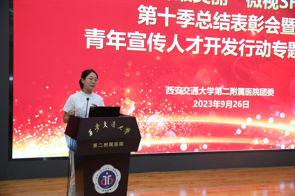 在第二部分开展的青年宣传人才开发行动专题讲座上,院团委特邀请到党委宣传部屈姝利担任主讲老师。屈姝利现任陕西省保健学会健康传播工作委员会委员,陕西省中西医结合学会健康传播委员会委员,西安交通大学驻站记者,医院“40”计划入围人员。屈老师以《一键get宣传技能》为题,用通俗易懂的语言讲解了宣传相关的实操技巧,团干部们纷纷表示受益匪浅,很具有实用性。