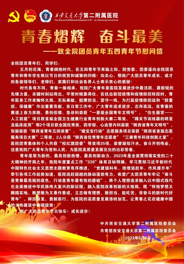 青年是常为新的,最具创新热情,最具创新动力。2023年是全面贯彻落实党的二十大精神的开局之年,我院年度重点工作“339”体系目标明确,学习贯彻习近平新时代中国特色社会主义思想主题教育有序推进,“党建强科年、倍增追赶年、作风提升年”牵引各项工作起势加速,医院追赶超越的脉动蓬勃有力,希望广大团员青年牢记“奋斗是青春最亮丽的底色,行动是青年最有效的磨砺”,将个人理想追求融入以中国式现代化全面推进中华民族伟大复兴的新征程,融入医院改革创新的大格局,既“怀抱梦想又脚踏实地,敢想敢为又善作善成,立志做有理想、敢担当、能吃苦、肯奋斗的新时代好青年”,踔厉奋发,勇毅前行,为医院的高质量发展添砖加瓦,让青春之花在健康中国的火热建设中绚丽绽放!