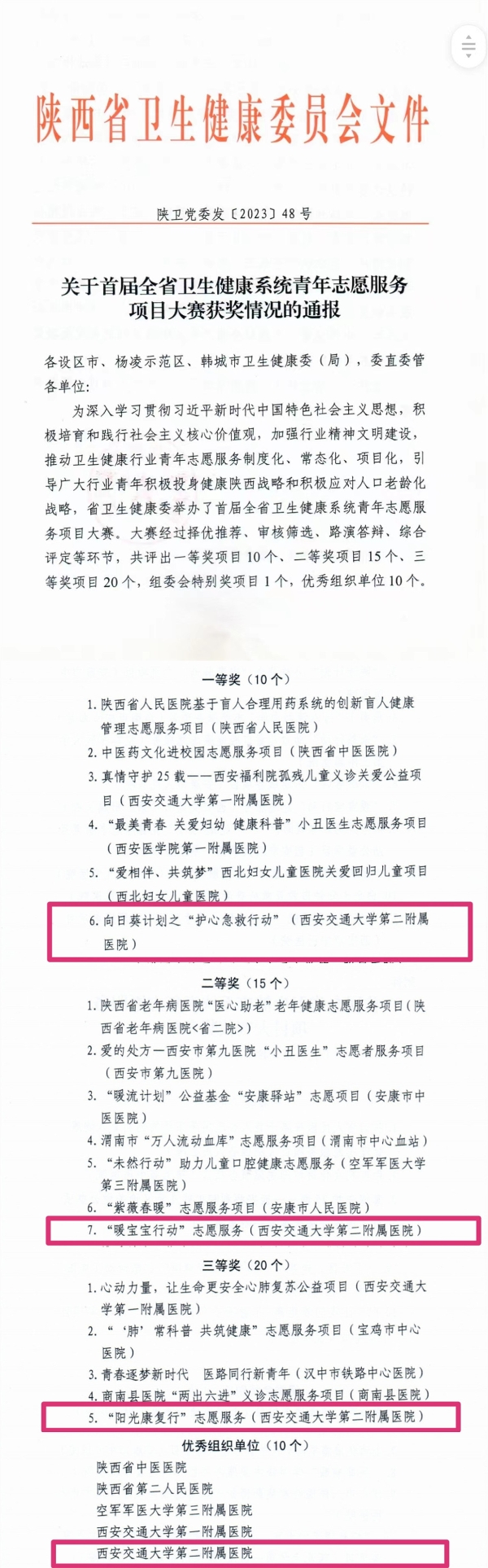 我院通过参加本届大赛,向全省卫生健康系统展现出二院团青“奉献、友爱、互助、进步”的志愿精神和“敬佑生命、救死扶伤、甘于奉献、大爱无疆”的卫生健康职业精神,所获荣誉更是我院历年来志愿服务项目成效的生动例证,希望全院团青以获奖集体为榜样,以志愿服务活动为契机,全面学习贯彻党的二十大精神,以满足人民群众日益增长的卫生健康需求为出发点,为推动全省卫生健康事业高质量发展凝聚强大青春力量!