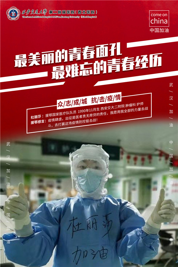 除夕当天,报名请缨参加首批医疗队的肿瘤科主管护师杜丽莎,是一名90后,她刚为女儿过完1周岁生日没几天,就主动报名援鄂,虽然她青春靓丽的脸庞被口罩勒破了皮,但她依旧被媒体称为“最美护士”。1993年出生的卢紫薇是二附院心内科的一名住院医师,今年是她入职的第一年,元宵节当天她跟医院其他130名医护人员一起组成第三批援鄂医疗队奔赴武汉华中科技大学同济医院中法新城院区,平时的乖乖女,转身成为女战士,面对陕西卫视的记者镜头,她笑着说,“我是90后,我在武汉一线,我已经长大了,相信我可以保卫祖国!”