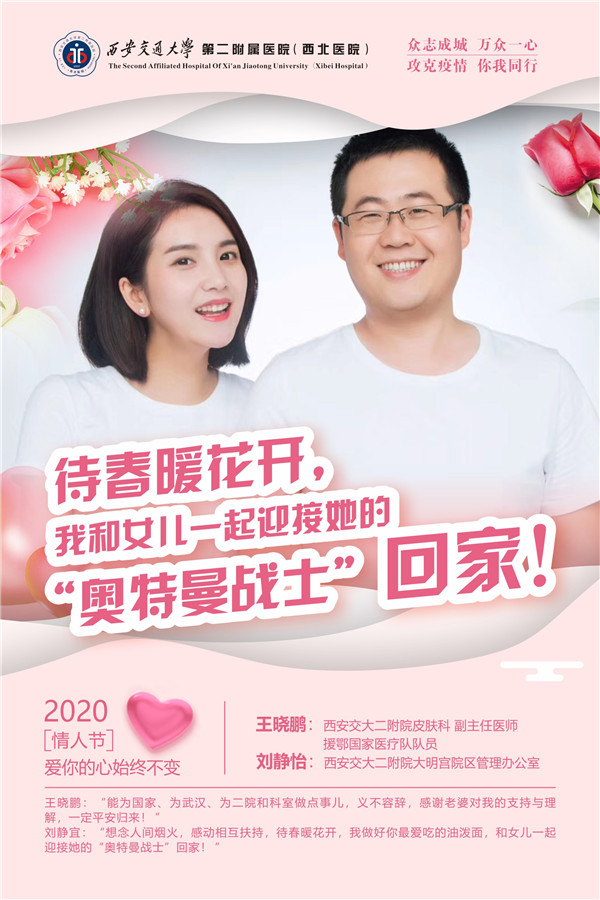 一线抗疫青年医护中,有很多夫妻档,他们在不同的岗位,践行着同样的初心,例如:援湖北国家医疗队队员、二附院皮肤科副主任医师王晓鹏,妻子刘静宜是二附院大明宫院区管理办公室职员;援湖北国家医疗队队员、耳鼻咽喉头颈外科病院副主任医师罗花南,妻子马思敬是同科室的护师。“等你平安归来!”是她们的共同心愿。