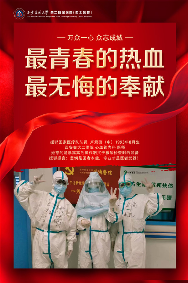 同时,院党委宣传部的青年工作人员,关注青年,在医院官微、院网、抖音等自有平台上,以《战“役”90后》《陕西援武汉医疗队员疫区日记》《众志成城 共渡难关》《最美逆行者》《发热门诊日记》等系列专栏,展示团员青年抗疫中的感人事迹,给予青年医务人员极大的鼓舞。“疫情爆发之后,来到前线比呆到家里心里踏实多了!希望能为祖国尽一些微薄之力。”援湖北国家医疗队队员、心血管内科90后医生吕侣如是说,这也是医疗队所有青年医护的心声。