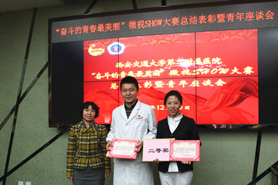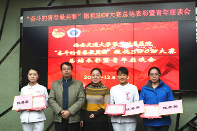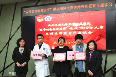 2014年12月10日下午,院团委在宗濂会议室召开“奋斗的青春最美丽”微视SHOW大赛总结表彰暨青年座谈会,党委副书记、纪委书记巩守平,党办主任党变玲,党委宣传部部长买秋霞,纪委监察室主任董淑彦,医务部主任李小鹏,护理部主任杨惠云,学生工作部主任吕晔以及全院团干部、团员青年代表近60人参加了此次会议。会议由院团委书记董艳主持。