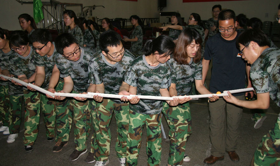 拓展培训的第二个环节是“流程管理”。该环节要求每名队员手拿一段PVC管依次衔接形成一条通道使一个乒乓球在通道内顺次滚动,同时,每队还需绕过障碍物,最终将乒乓球送入纸杯内;一旦乒乓球停滞或掉落,全队回到起点重新开始。这个项目非常具有挑战性。虽然在比赛中,两个队都经历了多次的失败,但面对教练一次次的讯问“要不要放弃?”所有队员都异口同声的大声回应“不要!”在挑战结束后,两个队分别组织各自队员进行反思和讨论,并推选出了3名代表分享感想。大家纷纷表示在比赛过程中感受到了团队合作的力量,体会到了责任心、归属感和相互信任的重要性;并联系实际工作中遇到的事情,表示在今后的工作中会正确处理与上级、下级和同事间的沟通和衔接,充分发挥青年人特有的实干和巧干精神,为医院美好的明天贡献力量。