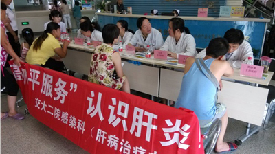为配合世界肝病日的活动,普及肝炎的相关知识,增加民众对肝炎的认识,推广规范化治疗,以便更好的控制肝炎在人群中的传播。西安交通大学医学院第二附属医院感染科在门诊部及宣传部的大力协助下,7月28日在我院门诊大厅一楼举办世界肝病日大型宣传义诊活动,活动主题是“世界肝炎日,让我们一起关爱肝病患者的健康” 、“认识肝炎,科学防治”,“这就是肝炎,了解它,面对它”,旨在呼吁人们认识肝炎,正视肝炎,远离肝炎。