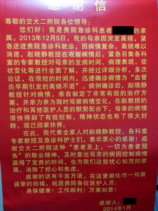 患者2013年12月6日持续发热10天,门诊治疗无效后以“发热待查”收住我科,主管医师赵晓静教授通过详细询问病史、细致查体制定了初步的检查治疗方案,在科室李丽君教授指导及其他相关科室的协助下,最终依据明确的实验室检查确定诊断,并依据患者个体差异制定了针对性治疗方案,患者康复出院。“发热待查”是我科收治的一大类常见疾病,其中一部分因多花费、多抽血、病情控制需时较长,有的甚至出院仍诊断不明而未完全控制,尤其在高龄患者,易出现焦虑、不稳定甚至不满情绪,一方面可能干扰医护诊疗活动,另一方面存在医患纠纷隐患,且可能影响诊疗效果。我科对该类病人已形成一整套治疗经验体会,从患者入院开始,就从病程、费用及可能检查、预后等方面多次、多方面与患者及家属进行沟通讲解,让患者在了解全程病情诊治进展同时,化解情绪波动,避免纠纷发生。今天的锦旗就是很好的验证。医护的精湛医术让患者感激,而患者的这种真诚感谢也让我们医护人员倍感欣慰,希望我们的医护关系犹如此刻严冬里的暖流温暖你我他……。