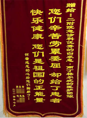 患者黄某某,是一名72岁革命老战士,终身献给了革命事业,至今无子嗣及亲属,因重度贫血在我科输液中心留观输液治疗,在一周的输液治疗过程中,医生每日按时认真仔细的给予诊治,输液室护士给予这位特殊的病人无私的帮助和护理,如同亲人一般,让这位老人十分感动,他激动地拉着护士长的手说:“你们医院的医生护士太好了,让我很感动!”为表达谢意,患者送来锦旗:您们辛苦劳累委屈,却给了患者快乐健康,您们是祖国的正能量!这是对我们工作的肯定,这是对医护工作的激励,更是医患关系正能量的体现!