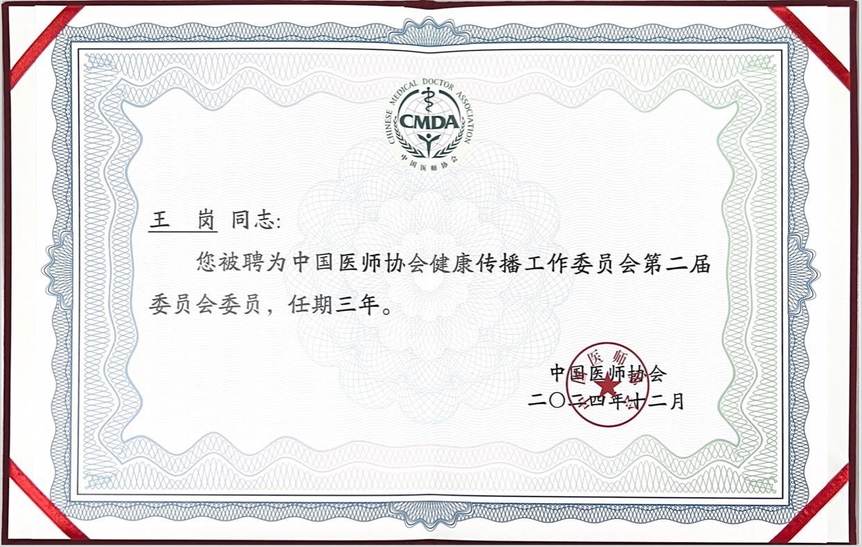 国家卫健委宣传司二级巡视员、健康传播工作委副主委刘哲峰介绍了第二届委员会组成过程。经过中国医师协会“三上三下”严谨、细致的审核、审批程序,最终筛选出来自各大医疗机构和院校、新闻单位、互联网平台的103位优秀健康传播者成为中国医师协会健康传播工作委员会第二届委员会委员。我科王岗教授作为全国重症医学领域唯一入选的委员,中国工程院院士、中国医师协会副会长、中国医师协会健康传播工作委员会主任委员詹启敏教授为王岗教授颁发聘书。中国医师协会健康传播工作委员会在普及医学知识、树立行业形象、架构医患桥梁、实现优质资源共享等方面,形成了全社会健康传播合力。