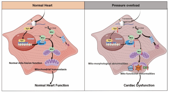 心力衰竭是全球心血管疾病死亡的主要原因之一,而病理性心肌肥厚是其重要病理基础。越来越多的证据表明,线粒体形态和功能缺陷在心肌肥厚向心力衰竭的转变中起关键作用。然而,线粒体形态功能缺陷的调控机制尚未完全阐明。研究团队发现去泛素化酶USP10在病理性心肌肥厚向心衰转变过程中显著下调,且与心衰标志物BNP水平呈负相关,恢复USP10表达减少线粒体碎片化,改善线粒体和心脏功能。进一步的机制研究发现,USP10可结合细胞质中的Mfn2,通过其679位组氨酸介导的去泛素化作用,去除Mfn2的K11/K48泛素链,抑制其被蛋白酶体降解,增强Mfn2稳定性,促进其向线粒体的转运,从而维持线粒体的形态与功能。本研究首次揭示了USP10在增强线粒体蛋白Mfn2稳定性中的调控机制,该过程发生在Mfn2转运到线粒体之前,表明USP10可能作为保护线粒体功能和预防病理性心肌肥厚的新靶点。