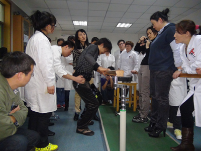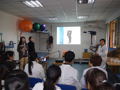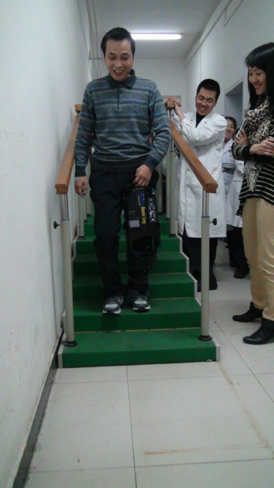?3月25日,康复医学科(脑病科)病区熙熙攘攘,这天全科人员正常上班,因脑卒中而瘫痪的病人也都早早排在治疗室门口,原来,科室今天举办了一场新康复治疗技术应用演示会。继科主任张巧俊教授新加坡学术交流之后,科室又特别邀请了新加坡Kinesis康复中心首席物理治疗师Diana Lau来院讲学,今天的主题是“TIBION BIONIC LEG(TBL,仿生腿)”。这是一项协助偏瘫患者进行早期康复训练的新技术。Diana首先讲述了TBL的原理和适用人群,接着又演示了如何使用TBL,并且为几位患者进行了TBL的康复训练。虽然Diana的中文不太熟练,但生动的演示使每位听者都明明白白。医务人员学得认真、兴趣盎然,病人们更是积极响应,每位都想当受试者,真可谓是一场别开生面的学术交流会。“仿生腿”是一种机械电子装置,集信息、电子、控制、生物医疗、材料、能源以及机械技术为一体,通过安装在仿生腿上的传感系统获取人体行走过程中的步态信息,并将信息传给微处理器,微处理器据此信息调节膝关节处的智能阻尼器,改变仿生腿步态,使偏瘫患者站立行走。大量国内外证据显示,积极、规范、全面的康复治疗可使90%的患者恢复行走能力,回归家庭和社会。康复治疗越早开始,肢体功能恢复得越快,同时也能预防因长期卧床所致的各种并发症。偏瘫患者早期使用“仿生腿”,不仅可以协助其尽早开始进行站立行走的康复治疗,而且更重要的是它帮助患者早期站立,对其建立自信心、增加主观能动性起到了积极的作用,从而加快了患者肢体功能恢复的进程。