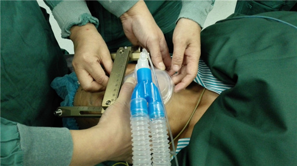 为了完成手术,患者需要于手术前在CT定位下安装建立体外立体定向引导支架。然而,该支架遮蔽了患者口鼻部,无法进行紧闭面罩加压给氧,如果行常规全身麻醉诱导,患者极有可能在插管成功前发生严重的低氧血症危及生命。即使患者在全身麻醉诱导期间没有发生低氧血症,一旦该患者出现插管困难,此时无法进行紧闭面罩加压给氧,患者亦会陷入窒息死亡的危险中。