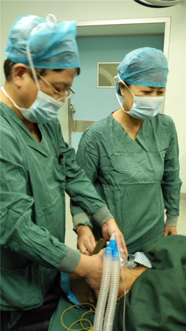 针对该病患者的特殊情况,在薛荣亮主任的领导下,我院麻醉科成立了由李芳、吕建瑞、宋正川、雷晓鸣、李思远副教授以及白洁、熊虹飞医师的团队,进行了充分的麻醉前讨论,建立了各种麻醉应急预案。首先,对该患者进行长时间的预冲氧以提高患者血氧含量、增加缺氧耐受性;其次,采用减压充气的儿童面罩对该患者进行单纯口部加压给氧;再次,采用快速诱导方式完成全身麻醉,尽量缩短非保护性气道的暴露时间;最后,准备了喉罩、可视喉镜、视可尼及纤维支气管镜等建立紧急气道的抢救措施。经过麻醉科团队的共同努力,患者麻醉诱导平稳、插管顺利、手术成功。