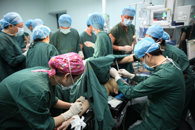 7月14日下午5时,在高亚副院长的现场指挥下,麻醉手术科、妇产科、小儿外科、新生儿科、超声科等多个科室10余名专家聚集手术室。先由超声科王华医师确定胎盘、胎头、子宫切口位置,避免胎盘剥离;麻醉科主任薛荣亮教授、副主任吕建瑞副教授精心实施全身麻醉,保证母儿生命安全;妇产科邬晋芳教授、刘明副教授执刀精准操作。胎儿胎头刚一娩出,在保护好脐带不受压及扭折情况下,即刻监测胎儿心率、外周血氧饱和度、宫内压,维持羊水循环,麻醉师丁晓英医师迅即熟练插入气管插管,建立人工通气;超声科副主任李小鹏副教授、王华医师实施双超声实时监测,并进行胎儿颈部畸形和心脏功能现场评估;小儿外科副主任李鹏副教授随即为新生儿进行颈部淋巴囊肿穿刺治疗,随后完成胎儿全身娩出,夹闭脐带;手术室赵丽燕护士长迅速建立静脉输液通道,新生儿科王惠萍主任接力监测处置,确保新生儿各项生命体征维持平稳。整个手术历时1小时结束,全程有序顺利。目前产妇和新生儿恢复良好,生命体征平稳。