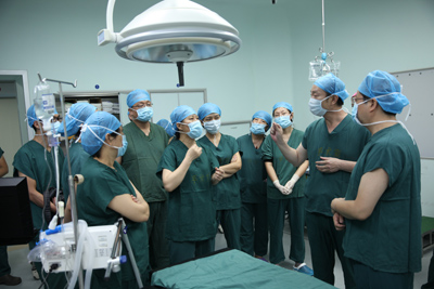 依照该院围产诊疗规范,该孕妇属于高危病例,医院立即启动先天性畸形围产诊疗应急程序,组成由副院长、小儿外科专家高亚教授任组长的专家团队,多学科专家进行多次联合会诊,决定为孕妇进行产时胎儿手术(EXIT),制定缜密的处置方案和应急预案。由超声科雷小莹教授、医学影像科白芝兰教授对胎儿情况再次会诊,明确诊断;妇产科副主任主改霞教授、主管教授邬晋芳、刘明与产妇及家属充分沟通,详细介绍病情与治疗方案,精心确定分娩方式并细化手术操作步骤;手术室赵丽燕护士长充分准备各种仪器设备和手术用物,组织人员反复熟悉手术流程。EXIT手术要求既要保证产妇生命体征平稳无宫缩,又要保证胎儿的脐带血有效供应,同时在有限的空间和短暂的时间对胎儿实施处置,每个环节麻醉科主任薛荣亮教授、副主任吕建瑞副教授都精心准备、反复论证,为保证手术顺利进行提供了有力保障。