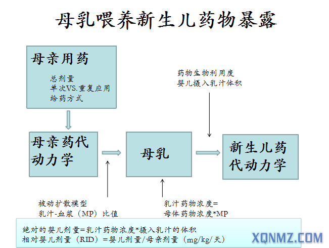 新生儿的药物暴露可以用新生儿绝对剂量(AID)或者新生儿相对剂量(RID)表示:AID=乳汁中药物浓度(为母亲血浆药物浓度X乳汁与血浆比值)X每天摄入的乳汁体积(约150mg/kg/天)。RID=AID/母亲药物剂量(mg/kg/天),这是计算新生儿和母体药物剂量关系的标准方法。